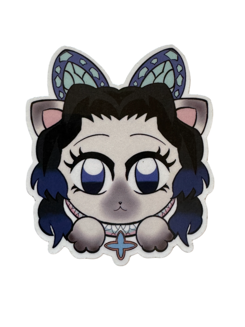 Enhance your belongings with the adorable Shinobu Meow sticker. Measuring 2-1/4" in length and 2-5/8" in height, this sticker is not only cute, but also water-proof, ensuring long-lasting use. Perfect for any anime lover or cat enthusiast. Add some fun to your everyday items with this must-have sticker.